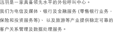 迅羽公司累積了眾多行業(yè)豐富的知識和經驗,通過科學的運營管理模式和逐漸完善的執(zhí)行手段,確保客戶的規(guī)劃和策略在呼叫中心服務中能真正得到保障。